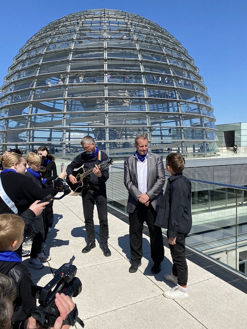 Empfang durch Jürgen Coße, MdB. Immer wieder singend durch das Paul Löbe Haus über die Fraktionsebene zur Kuppel und Dachterasse.