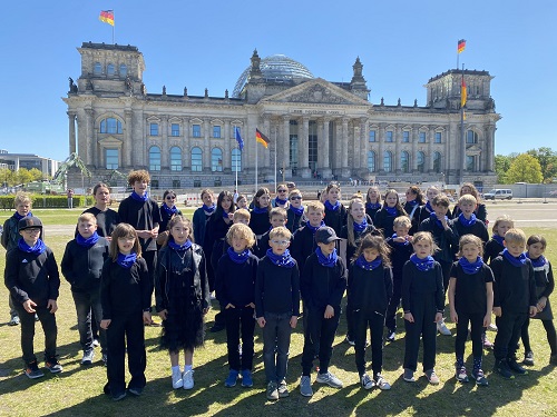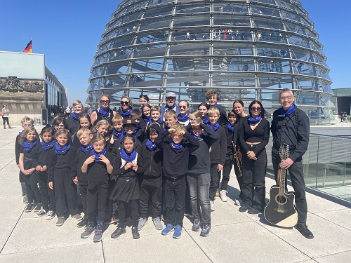 Abfahrt 5h in Tecklenburg. Ankunft 11h Berlin. Kleine Stadtrundfahrt. Gesang auf der Wiese vor dem Reichstag. 12h Paul Löbe Haus.