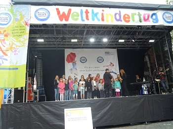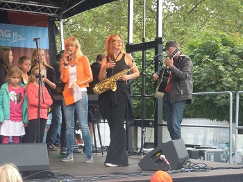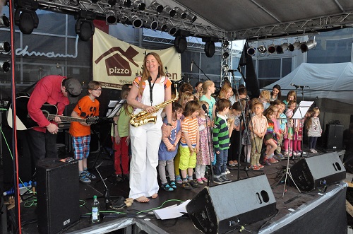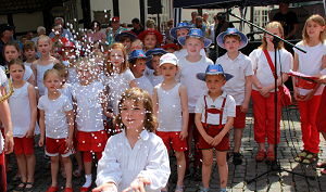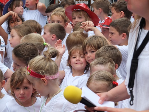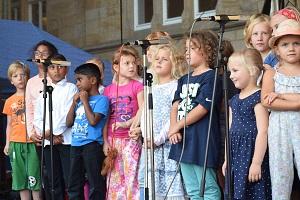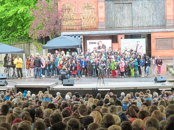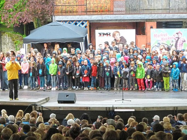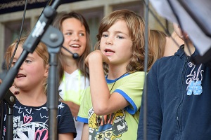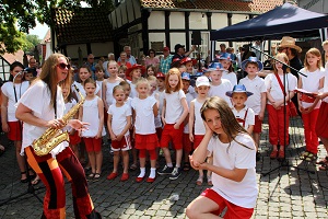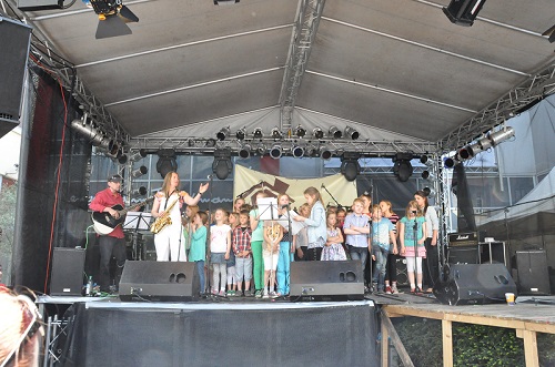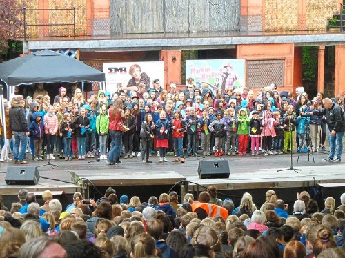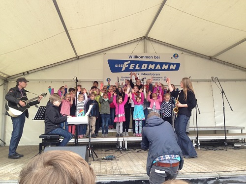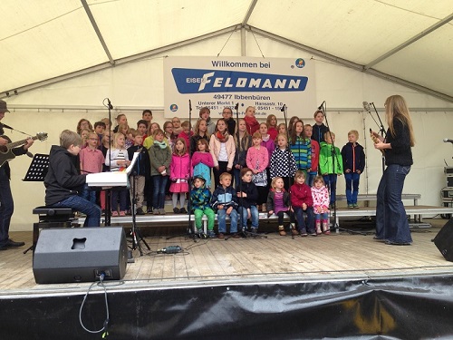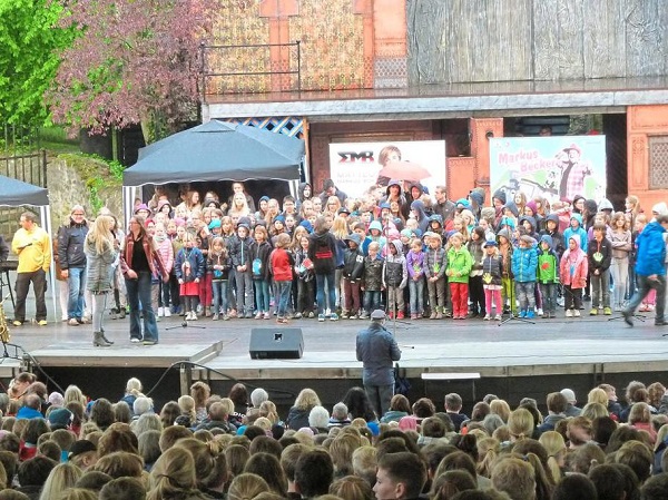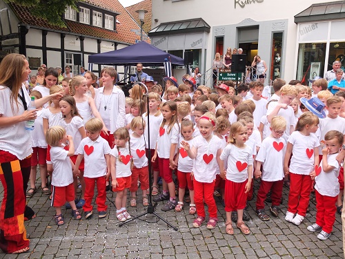 Pfingstmontag, 9. Juni 2014, sangen die MOLLMÄUSE & FRIENDS mit 130 Kindern auf dem Tecklenburger Marktplatz auf Wunsch des
